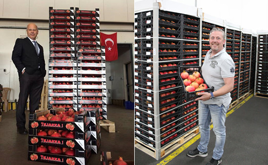 Links: Herr Gursoy von der Firma Gursoy Tarim. Die Granatäpfel der Marke Chakka werden exklusiv für die Firma P.Seelen verpackt. Rechts: Rene Leenders