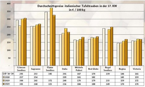 Italienische Tafeltrauben dominierten, allen voran Italia, Michele Palieri, Sugraone und Crimson Seedless. Erste Regal Seedless tauchten in Hamburg und München auf. Die Präsenz von Victoria