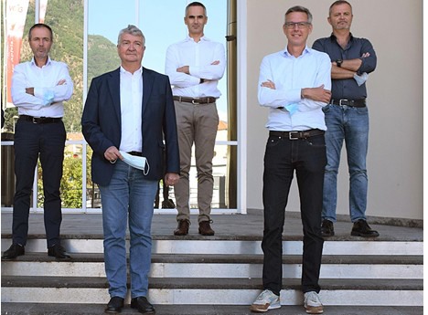 Thomas Oberhofer, Obmann des VI.P-Verbands und der neu gegründeten Gesellschaft Snacking Project, Georg Kössler, Obmann des VOG-Verbands, Walter Pardatscher, Direktor des VOG-Verbands, Martin Pinzger, Direktor des VI.P-Verbands & Marco Rivoira, Geschäftsführer von Rivoira