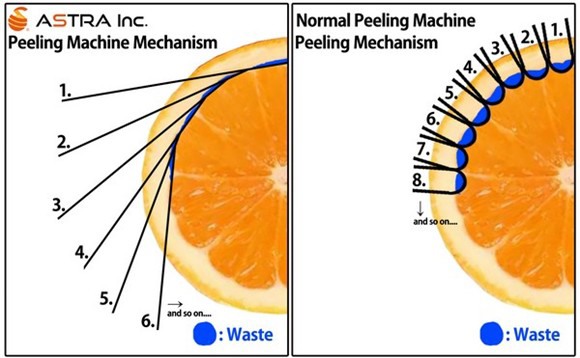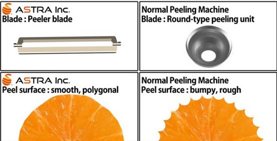 Im Vergleich zu Schälmaschinen mit rundlichen Klingen, bringt der "Blade Peeler" von ASTRA viele Vorteile bei der Leistung mit sich. "Zuerst einmal ist die Oberfläche der Früchte nach dem Schälen viel glatter als bei den Maschinen mit rundlichen Klingen, die eine ziemlich raue und huckelige Oberfläche zurücklassen. Der Blade Peeler verursacht weniger Schäden des Fruchtfleisches und es kann kein Saft austreten, wodurch die Früchte länger haltbar sind - sie bleiben einfach länger frisch. Außerdem arbeiten die geraden Klingen schneller und viel genauer, weshalb die Ertragsrate höher ist", sagt Ryo. "Der größte Vorteil des "Blade Peelers" ist aber, dass die Nutzer selbst einstellen können, wie tief die Klingen schneiden sollen. Für jede Obst- und Gemüsesorte gibt es ein passendes Programm. Das heißt es ist egal, ob man eine Orange mit dicker Schale oder eine Zitrone mit sehr dünner Schale schälen will - der Blade Peeler erbringt immer die bestmöglichste Leistung."