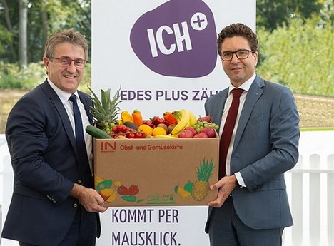 (v.l.n.r.) Manfred Hohensinner, Geschäftsführer ICH+ und Mag. Markus Kaser, Geschäftsführer INTERSPAR Österreich freuen sich über den Start der innovativen Obst- und Gemüsekiste.