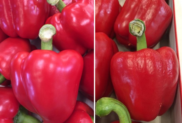 Testergebnisse von Paprikaschoten mit der Verpackungstechnik von PerfoTec & Oerlemans (links) und der traditionellen Verpackungsart (rechts), nach 25 Tagen bei einer Temperatur von 5°C.