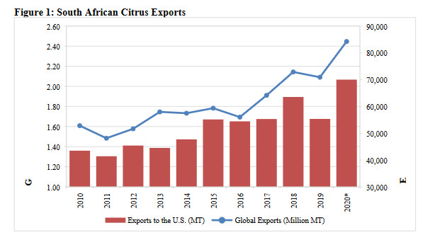 Es wird erwartet, dass die südafrikanischen Zitrusexporte im Jahr 2020 ein Rekordhoch erreichen werden. Diese Prognose basiert auf der Exportgeschwindigkeit bis August 2020, einer erhöhten Produktion, einem Höchststand der Nachfrage nach gesunden Nahrungsmitteln und begrenzten logistischen Unterbrechungen durch Covid-19. Die USA gelten als Premium-Markt und es wird erwartet, dass die südafrikanischen Zitrusexporte in die USA im Jahr 2020 ein Rekordniveau von mehr als 70.000 Tonnen erreichen werden. Dies entspricht einem Anstieg um 10% gegenüber dem bisherigen Rekord von 63.544 Tonnen im Jahr 2018. Der Zitrusfruchthandel zwischen Südafrika und den USA wird durch den African Growth Opportunity Act gefördert, der südafrikanischen Zitrusfrüchten steuerfreien Zugang zu den US-Märkten gewährt.