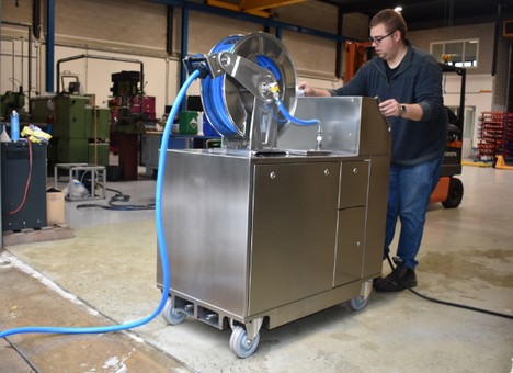 „Unser neuestes Skumix-Verfahren haben wir speziell für die lebensmittelverarbeitende Industrie entwickelt. Durch den Niederdruck wird die Schaumleistung wesentlich erhöht und der Schaum bleibt entsprechend länger und fester an der Oberfläche haften. Wie lange der Schaum schlußendlich hält, ist vom Kunden individuell nach sein eigenen Wünschen und Gegebenheiten einzuregeln und hängt stark von verschiedenen Faktoren, etwa der Schaumkonsistenz konzentration, Wasserqualität und Raumtemperatur, ab“, erläutert Christian Eidam, Verkaufsleiter beim Unternehmen.