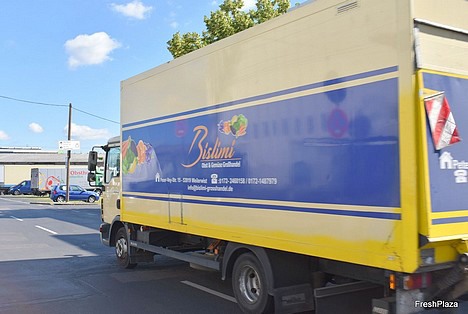 Ein Lieferfahrzeug der Firma Bislimi verlässt das Kölner Marktgelände