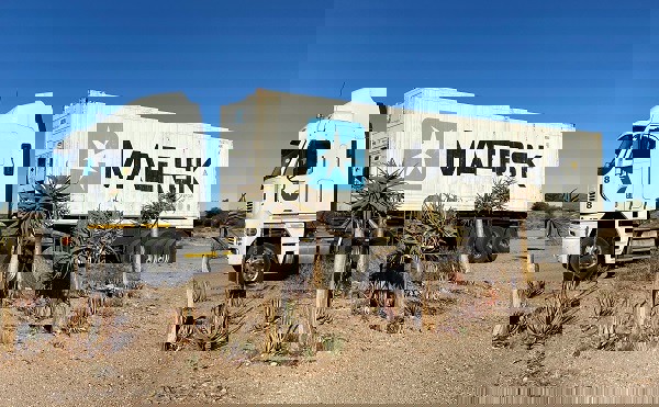 Ein Container mit biologischen Tafeltrauben neben den Köcherbäumen des Nordkaps