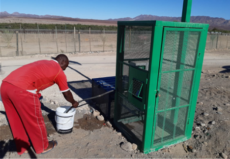Der von einigen Unternehmen installierte Wasserspender in der informellen Siedlung, der allen Arbeitern zu einem minimalen Preis von 1 N$ für 20 Liter gereinigtes Wasser zur Verfügung steht. Sie können auch Dispenser-Karten im örtlichen Laden kaufen (Fotos von Willem Visser).