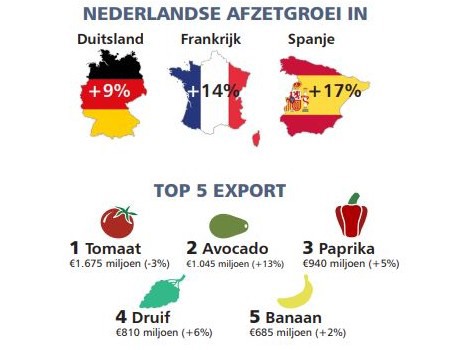 Es wurde 9 Prozent mehr Obst und Gemüse nach Deutschland verschickt. Mit einem Gesamtumsatz von 4,8 Milliarden Euro ist dies für die Niederlande der wichtigste Markt. Paprika, Gurken, Tomaten und Äpfel trugen am meisten zum Wachstum bei. Großbritannien ist der zweite Markt mit einem Umsatzwert von 1,2 Mrd. € (+2%). Die Umsätze in Frankreich (+14%) und Spanien (+17%) stiegen ebenfalls, vor allem dank höherer Umsätze mit Avocados und Orangen.