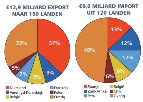 Die Niederlande haben es auch im Jahr 2020 wieder geschafft: Sie sind globaler Marktführerakteur für frisches Obst und Gemüse. Der Umsatz mit frischem Obst und Gemüse im Ausland stieg um 6 Prozent auf 12,9 Milliarden Euro. Das Wachstum ist vor allem auf importiertes Obst zurückzuführen, das oft über den Hafen von Rotterdam in Europa Fuß fasst und zusammen mit niederländischen Produkten als Gesamtpaket in das europäisches Hinterland weiterverkauft wird. Der Absatz von Obst im Ausland stieg um 13 Prozent, der von Gemüse um 1 Prozent im Vergleich zu 2019. Die Top 3 Absatzmärkte: Deutschland, Großbritannien und Belgien.