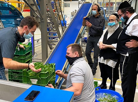 Im Rahmen der Produktabnahme wurden Tests mit allen vier beim Kunden zu verarbeitenden Produkten durchgeführt. Hierbei kontrollierten die anwesenden Rabbis die Rohware vor und nach dem Waschen, um sicherzustellen, dass das Waschergebnis den Anforderungen der koscheren Produktion entspricht. Die drei GEWA 3800 PLUS Waschmaschinen, davon zwei mit Vibrationsaustrag, die mittlere Maschine mit Tauchband sowie alle drei mit Luftgebläse und weiteren Optionen ausgestattet, sind Teil einer kompletten Produktionslinie. Mit der Linie wird Grünkohl und Romanasalat geschnitten, gewaschen, geschleudert und verpackt sowie Rucola und Spinat gewaschen, geschleudert und küchenfertig verpackt.