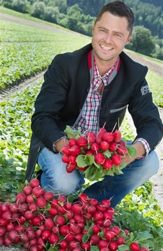 Rechts: Täglich liefert Gemüsebauer Anton Giner aus Thaur neben Radieschen auch Jungzwiebel und Salate frisch an SPAR. / Bild: Spar