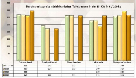 Südafrikanische Chargen überwogen, insbesondere standen Crimson Seedless und Thompson Seedless sowie verschiedene Arra-Trauben bereit. Erste La Rochelle kosteten in Hamburg 14,- € je 4,5-kg-Packstück. Die Verfügbarkeit reichte aus, um den Bedarf mühelos zu befriedigen. Die Nachfrage hatte sich mancherorts verdichtet, das frühlingshafte Wetter verbesserte die Unterbringungsmöglichkeiten. Vor allem bei hellen kernlosen Früchten griffen die Kunden gerne