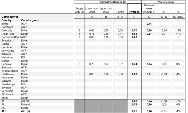 In der vergangenen Woche sind die Preise für Bananen aus Kolumbien um 11% gesunken, während die Preise für Bananen aus Costa Rica um einen Pence gestiegen sind.