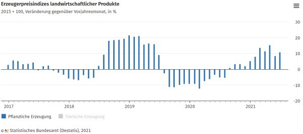 Die Erzeugerpreise landwirtschaftlicher Produkte waren im Juli 2021 um 9,0 % höher als im Juli 2020. Wie das Statistische Bundesamt (Destatis) mitteilt, fielen die Preise gegenüber Juni 2021 um 0,3 %. Wie in den vergangenen Monaten ist der hohe Preisanstieg für pflanzliche Erzeugnisse im Juli 2021 um 11,0 % gegenüber Juli 2020 vor allem auf die höheren Preise für Getreide zurückzuführen. Sie lagen um 21,2 % über dem Niveau des Vorjahresmonats. Im Juni 2021 hatte die Veränderung sogar +27,9 % betragen. Gegenüber dem Vormonat ging der Preis im Juli 2021 aufgrund der neuen Ernte um 7,3 % zurück.