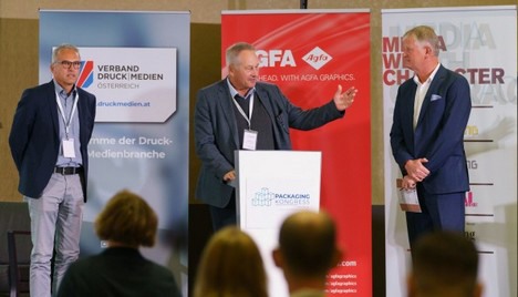 © Verband Druck Medien / DraperDieter Simon (Verband Druck Medien), Gerald Watzal (Präsident Verband Druck Medien) und Michael Seidl (Moderator und Mitveranstalter) eröffnen den Packaging Kongress © Verband Druck Medien / Draper
