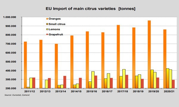 Für die Saison 2020/2021 sind die Orangenimporte in die EU im Vergleich zur letzten Saison leicht zurückgegangen, ebenso wie die Grapefruitimporte. Die Importe von kleinen Zitrusfrüchten und Zitronen waren leicht höher.