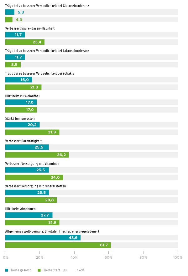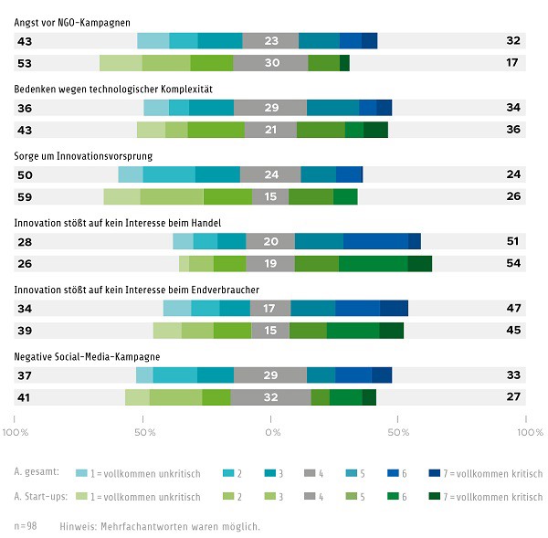 Hier kristallisiert sich Klimaneutralität zunehmend als polarisierendes Thema heraus: Die Unternehmen sehen in ihr sowohl Chancen zur Differenzierung vom Wettbewerb als auch kommunikative Risiken. Zum ersten Mal sind in diesem Jahr Start-ups Gegenstand des Deutschen Innovationsreports Food, sie wurden in der Auswertung gesondert betrachtet. Ergebnis: Start-ups kommunizieren mit weniger Sorge, nutzen andere Kanäle und haben generell bei Innovationen häufiger den Gesundheitsnutzen ihrer Produkte im Blick. Auch die Frage nach möglichen Kooperationen zwischen den Unternehmen und Forschungseinrichtungen war Teil der Befragung.