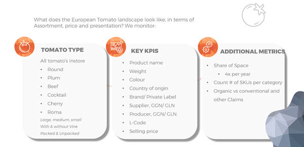 Auf die Frage, ob es nicht schwierig war, das fragmentierte Tomatenangebot zu erfassen, antwortet Christiaan: "Wir verwenden eine Kombination aus künstlicher Intelligenz (KI) und dem menschlichen Auge. Wir wissen, nach welchen Informationen wir suchen, und können daher viele Informationen automatisch aus Verpackungen und Regaletiketten extrahieren. Zusammen mit einem geschulten Auge führt dies zu Daten höchster Qualität. Durch die Darstellung in einem leicht zu navigierenden Online-Dashboard sind diese Daten in Echtzeit sichtbar und zugänglich."