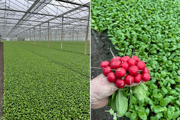 Laut John ist die Qualität der Radieschen gut, "nur die Blätter sind im Moment schwächer. Wir sind gerade dabei, die Radieschenbündel zu ernten, die vor zweieinhalb Monaten gesät wurden. In anderen Jahren hatten wir einige Wintertage mit mehr Licht, aber die letzten Monate hatten wir viel Regen und dunkle, graue Tage. Ich würde also lügen, wenn ich sagen würde, dass die Pflanzen sehr stark sind. Mit den Radieschen ist alles in Ordnung, aber die Blätter sind nicht so kräftig wie im Sommer."