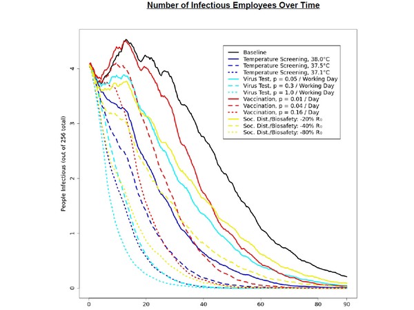 "Der vertrauliche Bericht enthält eine Menge detaillierter Daten", sagte Surendran. "Die Erstellung des Berichts dauert je nach Eingaben etwa ein bis zwei Stunden, und es werden verschiedene Szenarien durchgespielt. Sogar für Faktoren wie die Temperatur von Arbeitskräften, die den Betrieb betreten, kann man vorhersagen, wie hoch die Wahrscheinlichkeit ist, dass sich eine andere Arbeitskraft mit dem Virus ansteckt, wenn eine Person positiv getestet wird. Wenn man alle Temperaturen der Personen im Unternehmen kennt, kann man diejenigen mit hohen Temperaturen, z. B. über 37,5, auf den Betrieb beschränken, da für sie ein höheres Übertragungsrisiko innerhalb der Belegschaft besteht. Es können auch andere Dinge wie gemeinsame Unterbringung und Impfungen berücksichtigt werden. Es liefert also Informationen, die ein Unternehmen nutzen kann, um Strategien zur Eindämmung von COVID zu entwickeln und gleichzeitig sicherzustellen, dass die Produktion auf einem optimalen Niveau bleibt."