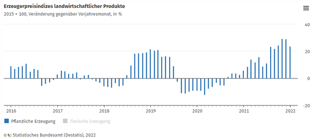 Die Erzeugerpreise landwirtschaftlicher Produkte waren im Januar 2022 um 21,1% höher als im Januar 2021. Gegenüber Dezember 2021 stiegen die Preise um 1,7%. Wie das Statistische Bundesamt (Destatis) weiter mitteilt, erhöhten sich die Preise für pflanzliche (+23,6%) deutlich gegenüber dem Vorjahresmonat.