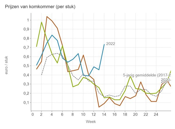 VBT-Zahlen Gurke bis einschließlich Woche 14. Die Preise für 2022 liegen deutlich über denen von 2020, 2021 und dem 5-Jahres-Durchschnitt.