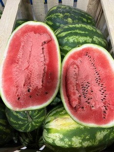 weshalb die Kalibrierung der ersten Wassermelonen nicht optimal war und eher ungeeignet für den Export. Das Stückgewicht lag überwiegend zwischen 5-11 kg, was der beliebten Kalibrierung um 10-15 kg bei weitem nicht entspricht. Auch der Zuckergehalt der ersten Partien war noch nicht so berauschend, weshalb wir auf die erste gute Ware gewartet haben."