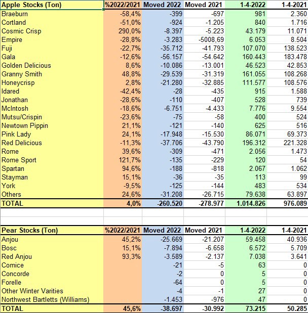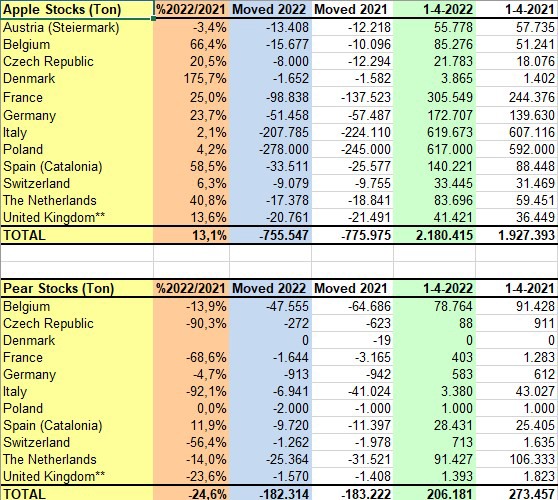 Die WAPA erhebt jeden Monat die Bestandszahlen für Äpfel und Birnen aus Europa und den Vereinigten Staaten. Die europäischen Apfelbestände lagen zum 1. April 2022 bei 2.180.415 Tonnen und damit 13,1% über dem Wert von 2021. Dieser Trend erklärt sich durch die Zunahme bei Red Jonaprince (46,6% mehr als 2021), Jonagold (+38,6%), Gala (+33,8%) und Golden Delicious (+26%), obwohl mehrere Sorten im Vergleich zu 2021 einen Rückgang verzeichneten, darunter Gloster (-55,4%) und Granny Smith (-19,1%). Die Birnenbestände hingegen lagen am 1. April 2022 bei 206.181 Tonnen und damit 24,6% unter dem Volumen von 2021. Neben den italienischen Sorten, die fast auf Null gesunken sind (Abate Fetel -99,8% und Kaiser -99,3% im Vergleich zu 2021), liegen auch die Conference-Birnen um 13,1% niedriger als im Vorjahr.