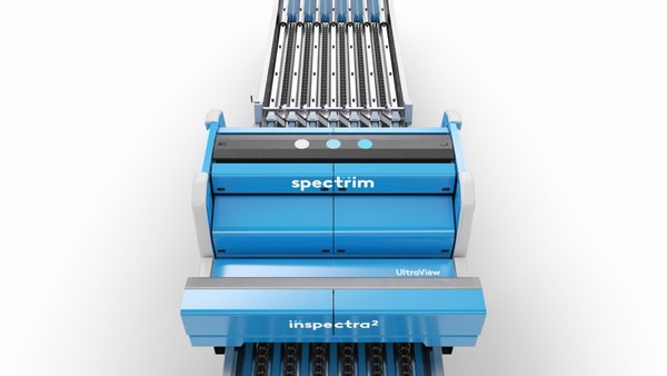 "Das UltraView-Inspektionsmodul lässt sich in Spectrim integrieren, um dessen Sehkraft auf die nächste Stufe zu heben. Mit einem speziellen Satz hochauflösender Multispektralkameras (Farb- und Infrarotkameras) und LED-Leuchten, die idealerweise in der Nähe der Frucht und parallel zu ihrer Fahrtrichtung angebracht sind, kann UltraView Fehler erkennen, die sonst nicht erkannt werden. UltraView kann Defekte erkennen, die sonst nur schwer oder gar nicht in der Stammschale und im Spitzenbereich der Frucht zu finden sind."