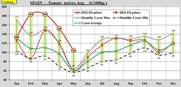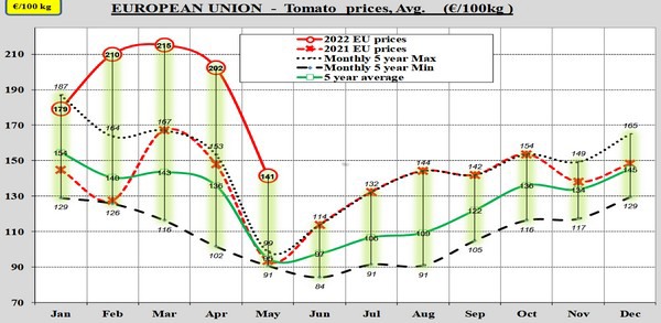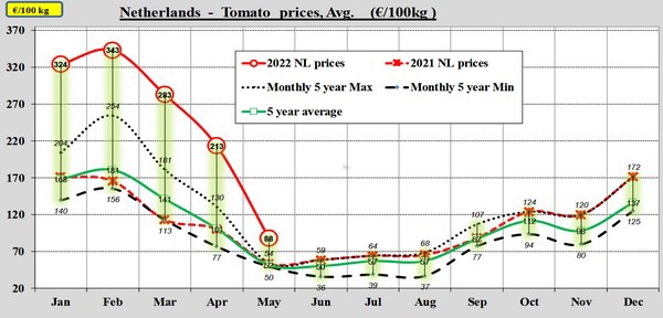 Im Mai sind die Tomatenpreise wie erwartet weiter gesunken. Dennoch sind die Preise immer noch überdurchschnittlich hoch. In den Niederlanden gingen die Preise sehr stark zurück. In Spanien hingegen fielen die Preise etwas weniger stark. Eine neue Aktualisierung des Tomaten-Dashboards der Europäischen Kommission zeigt, dass in beiden Ländern der Ertrag pro Kilogramm Tomaten unter dem europäischen Durchschnitt liegt.