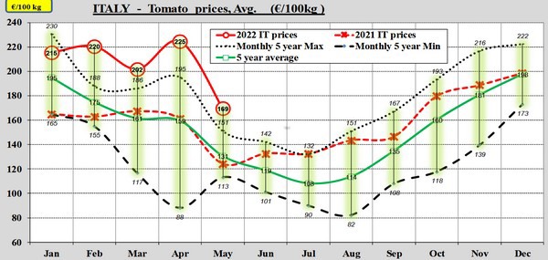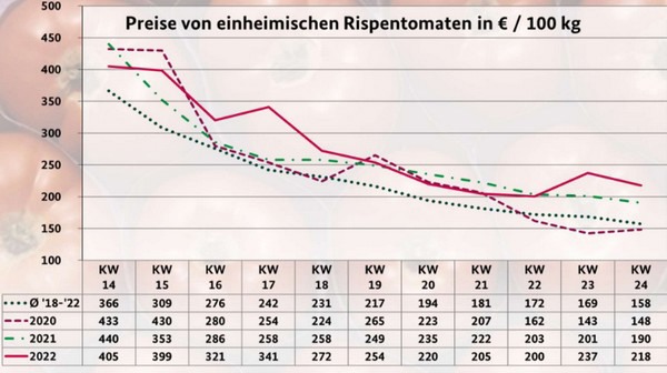 Auch auf den deutschen Großhandelsmärkten liegt der Preis nach einem Bericht der BLE deutlich über dem Fünfjahresdurchschnitt. Um die 17. und 18. Woche herum ist hier ein Rückgang, dann aber eine Kurserholung zu beobachten. Bei den deutschen Tomaten sind die Preise, nachdem sie sich im Mai leicht dem Fünfjahresdurchschnitt angenähert hatten, im Juni sogar wieder gestiegen.