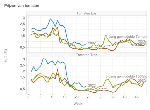 Die Tatsache, dass der Tomatenmarkt nach einem Preisrückgang Anfang Mai schnell ein neues Gleichgewicht gefunden hat, ändert nichts an der Tatsache, dass es noch ein schwieriger Sommer werden könnte. Eine Steigerung der Tomatenproduktion, wie sie auch in einem aktuellen WUR-Bericht beschrieben wird, ist weiterhin möglich. Zumal im Sommer auch Tomaten aus Ländern mit weniger hoch technisierten Gewächshäusern auf den Markt kommen. Darüber hinaus spielt auch das Wetter eine Rolle beim Konsum. Und dann ist da noch die Inflation, die die Verbraucher in ihren Geldbeuteln trifft. Auch das kann Auswirkungen haben.