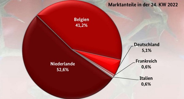 Strauchtomaten aus den Niederlanden und Belgien unterscheiden sich auf den Großhandelsmärkten preislich kaum voneinander. Das deutsche Produkt wird deutlich besser bezahlt, hatte aber in der 24. Woche nur einen Marktanteil von 5,1 Prozent gegenüber 41,6 Prozent in Belgien und 52,6 Prozent in den Niederlanden. Auch bei Kirschtomaten lagen die Preise in Woche 24 über dem Fünfjahresdurchschnitt. Mit 53,6 Prozent hatten die Niederlande in Woche 24 den mit Abstand größten Marktanteil, gefolgt von Belgien mit 20,5 Prozent und Italien an dritter Stelle mit 14,3 Prozent.
