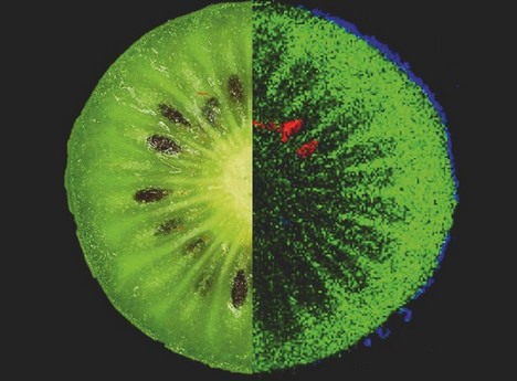 Die Anwendungspotenziale im Bereich von Obst und Gemüse belegen Untersuchungen an Kiwis und Karotten. Die „Mini-Kiwi“ (Actinidia arguta) ist nicht nur süß, sondern hat auch zahlreiche gesundheitsfördernde bioaktive Inhaltsstoffe. Mit Probeschnitten, die nur wenige hundertstel Millimeter dick und bis zu einer Temperatur von minus 40 Grad heruntergekühlt waren, haben die Bayreuther Bioanalytiker die Verteilung einiger Substanzen in der Schale und im Fruchtfleisch sichtbar gemacht: Zuckermoleküle (Disaccharide), antioxidativ wirksames Polyphenol und ein für Kiwis charakteristisches Fett (Lipid).