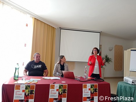 Der Unternehmer Antonio Di Leonforte erläuterte anschließend seine Erfahrungen als Pfirsicherzeuger. Petronilla Virzi, die Vizepräsidentin des Konsortiums, war ebenfalls anwesend.