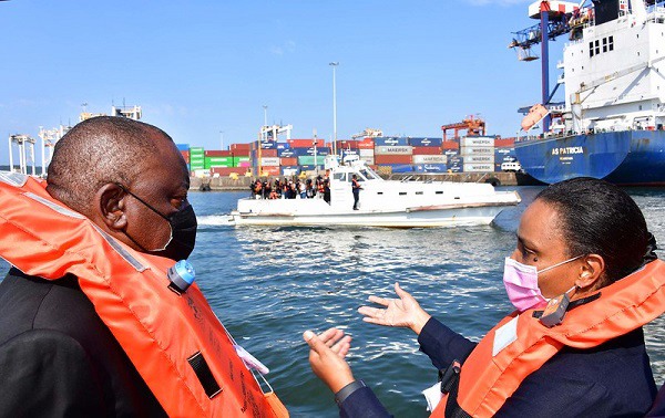 Präsident Cyril Ramaphosa mit Transnet-CEO Portia Derby bei einem Besuch des Durban Container Terminals im April 2021 (Foto: Government Communication and Information Services)