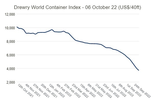 Die Verluste des Drewry's World Container Index (WCI) halten weiter an. Der Index verlor 8 Prozent und beendete die Woche mit einem Stand von 3.688,75 US$, womit sich seine wöchentliche Verlustserie auf 32 Wochen verlängerte. Der Index hat nun 76 Prozent seiner Gewinne seit den Niveaus vor der Pandemie verloren.