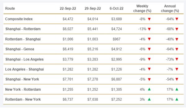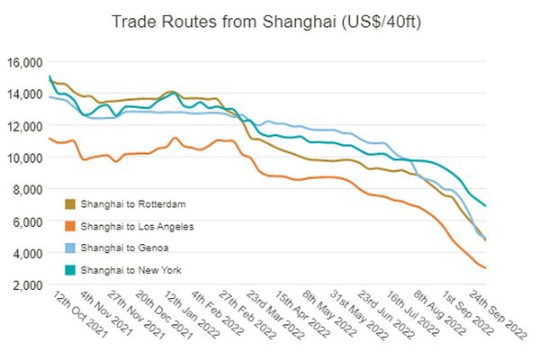 Während die Spotraten im Fahrtgebiet Europa-USA jährlich um 17 Prozent gestiegen sind, sind die Raten für die Fahrtgebiete China-USA und China-Europa zwischen 55 und 75 Prozent gefallen. Das Fahrtgebiet Shanghai-Los Angeles (USWC) fiel unter 3.000 US$, was angesichts der geringen Nachfrage und der goldenen Woche in China nach 26 Monaten ein Novum darstellt.
