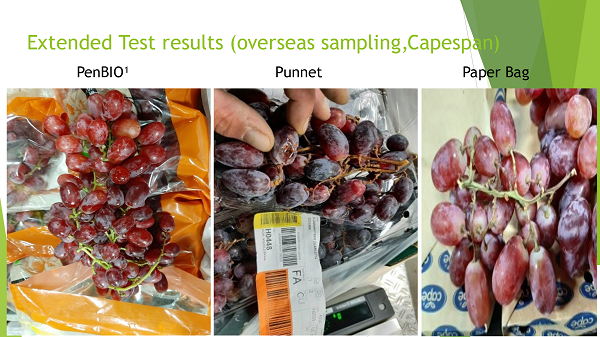 Trauben nach 70 Tagen in Penbio1 im Vergleich zu Trauben desselben Blocks, die in Kisten und Papiersäcken mit Polycoat versandt wurden (keine SO2-Folien verwendet)