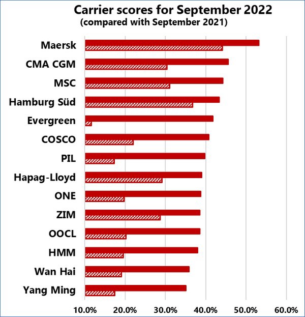 Mit einer Fahrplanzuverlässigkeit von 53,2 Prozent war Maersk im September 2022 die zuverlässigste Reederei, gefolgt von CMA CGM mit 45,5 Prozent. Weitere 4 Reedereien verzeichneten eine Fahrplanzuverlässigkeit von 40-50 Prozent, während die übrigen alle eine Fahrplanzuverlässigkeit von 30-40 Prozent aufwiesen. Yang Ming verzeichnete mit 35,1 Prozent die geringste Fahrplanzuverlässigkeit. Auch im September 2022 lagen die meisten Reedereien sehr dicht beieinander, wobei der Unterschied zwischen Yang Ming als Schlusslicht und CMA CGM an zweiter Stelle etwas mehr als 10 Prozentpunkte betrug.