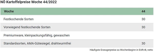 Kurz nach Abschluss der Erntearbeiten sind die Anlieferungen von Seiten der Landwirte entsprechend überschaubar, aber für die ruhige Inlandsnachfrage durchaus bedarfsdeckend – Meist sind die Konsumenten nach den Aktionsverkäufen des LEH noch recht gut mit Ware eingedeckt – Im Export gibt es weiterhin nennenswertes Interesse an österreichischer Ware, angesichts der unterdurchschnittlichen Erntemenge wird dieser von den Aufkäufern aber nur eingeschränkt bedient – Bei den Erzeugerpreisen gab es gegenüber der Vorwoche keine Änderung – In Niederösterreich werden für Speisekartoffeln meist 30,- Euro/100 kg bezahlt – Für Partien mit überdurchschnittlich hohen Absortierungen liegen die Preise etwas darunter – Aus Oberösterreich wurden ebenfalls unveränderte Preise von bis zu 30,- Euro/100 kg gemeldet – Witterungsbedingt dauern hier die Erntearbeiten noch an – Diese sollten aber in der nächsten Woche auch ihren Abschluss finden, meldet die Landwirtschaftskammer Österreich.