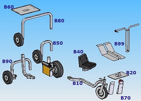 "Dieses Basismodell kann kostengünstig mit verschiedenem Zubehör für die Ernte fast aller Gemüsearten ergänzt werden. Die Umrüstung erfolgt in wenigen Minuten für die Ernte der nächsten Gemüsesorte. Die Zeichnung zeigt einige Beispiele für mögliche Maschinenkonstruktionen, aber das System erlaubt es dem Gärtner auch, sein eigenes Modell zu entwerfen."