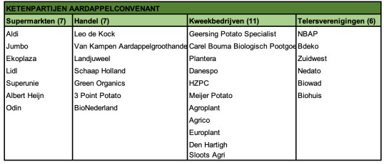 Sieben Einzelhändler, darunter Albert Heijn, Jumbo, Aldi, Lidl, Ekoplaza, Odin und Superunie, verpflichten sich nun, diese Kartoffelsorten zu fördern und zu verkaufen, mit dem Ziel, innerhalb von fünf Jahren ausschließlich widerstandsfähige Kartoffeln im Bio-Sortiment anzubieten. Sie fordern die Lieferanten außerdem auf, robuste Sorten für verarbeitete Kartoffelprodukte wie Chips, Pommes frites und Kartoffelscheiben zu wählen. Neben den Einzelhändlern haben auch 7 Lieferanten von Supermärkten, 11 Zuchtunternehmen und 6 Erzeugerverbände unterzeichnet.