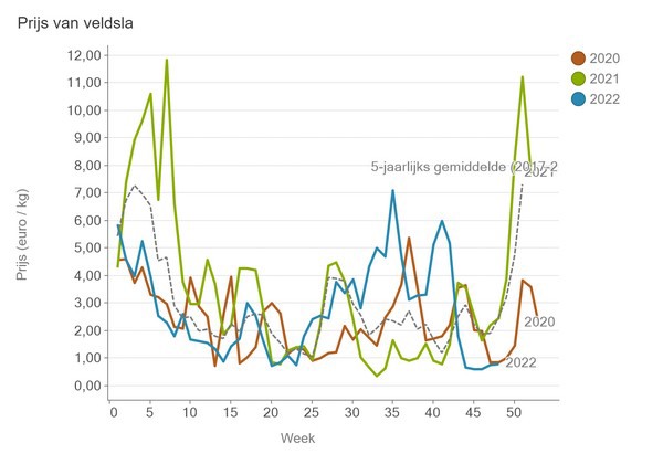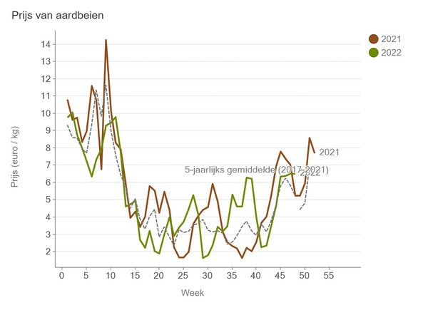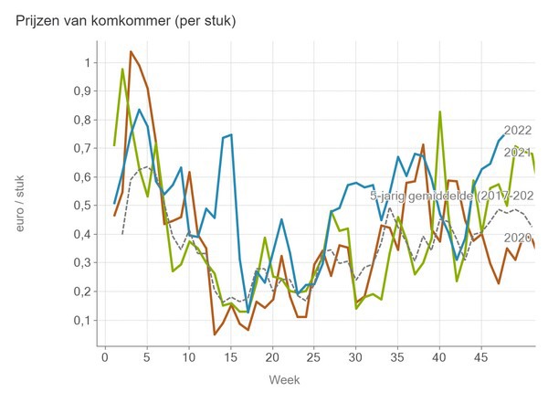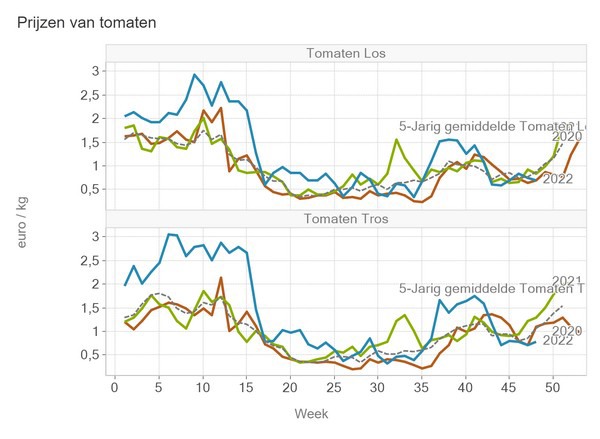 Der Durchschnittspreis für lose Tomaten ist in Woche 48 leicht gesunken. Auch hier liegt der Mittelpreis unter dem Fünfjahresdurchschnitt. Die Mengen, die letzte Woche beim Verband der belgischen Gartenbaugenossenschaften angekommen sind, waren niedriger als in den Jahren 2021 und 2020. In Woche 47 war das Volumen 2022 immer noch höher als 2021. Wenn der traditionelle Preisverlauf beibehalten wird, sollten die Preise gegen Weihnachten wieder steigen.