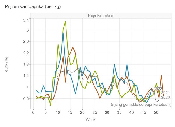 Der Mittelpreis für Paprika ist in der letzten Woche wieder über den Fünfjahresdurchschnitt gestiegen. Roter Paprika, dessen Preis im Vergleich zu gelbem und orangefarbenem Paprika in letzter Zeit unter dem Fünfjahresdurchschnitt lag, liegt jetzt ebenfalls über dem Durchschnitt für diese Jahreszeit.