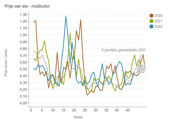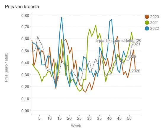 Die Preise für die meisten Salate sind in Woche 48 gestiegen. Nur der Preis für Lollo Bionda aus dem Gewächshaus ist in Woche 48 gefallen. Der Preis für Lollo Rosso ist fast gleich geblieben. Der Mittelpreis für Kopfsalat liegt über dem Fünfjahresdurchschnitt.