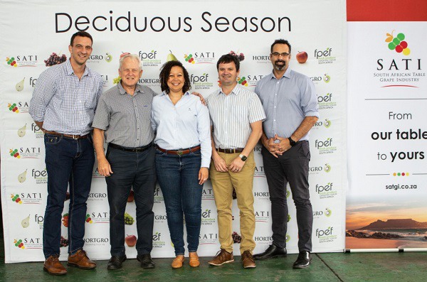SATI-CEO AJ Griesel, Glen Steyn von der Westkap-Regierung, Mecia Petersen, SATI-Managerin für Marktentwicklung und Kommunikation, Jacques du Preez, Generaldirektor von Hortgro und Werner van Rooyen, COO FPEF