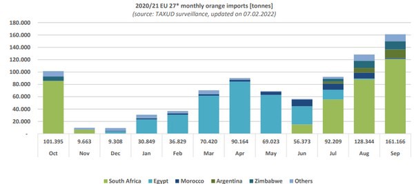 Die Europäische Union importierte im Oktober 2022 172.730 Tonnen Zitrusfrüchte, im Vergleich zu 181.836 Tonnen im Oktober 2021, wobei die mit Abstand größten Mengen aus Südafrika kamen (147.629 Tonnen im Jahr 2022 und 181.836 Tonnen im Jahr 2021).