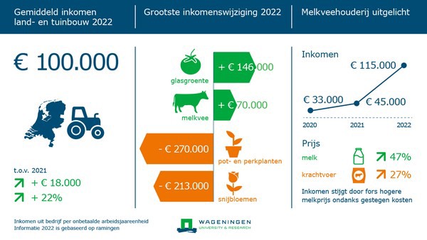 Im Jahr 2022 wird das Durchschnittseinkommen pro unbezahlter Jahresarbeitseinheit (aje) für niederländische Landwirtschafts- und Gartenbaubetriebe auf 100.000 Euro geschätzt. Das sind 18.000 Euro mehr als das Durchschnittseinkommen im Jahr 2021. Auch das Einkommen im Jahr 2022 ist um 34.000 Euro höher als der Durchschnitt der Jahre 2017-2021.
