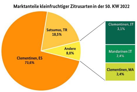 spanischen Clemenules sowie die zahlreich zugeführten Satsumas aus der Türkei den Handel prägten. Italienische 500-g-Aufmachungen als auch marokkanische Clementinen ergänzten das Geschehen auf einigen Märkten. Die Notierungen des primären Sortiments verharrten laut BLE auf dem Niveau der Vorwoche.